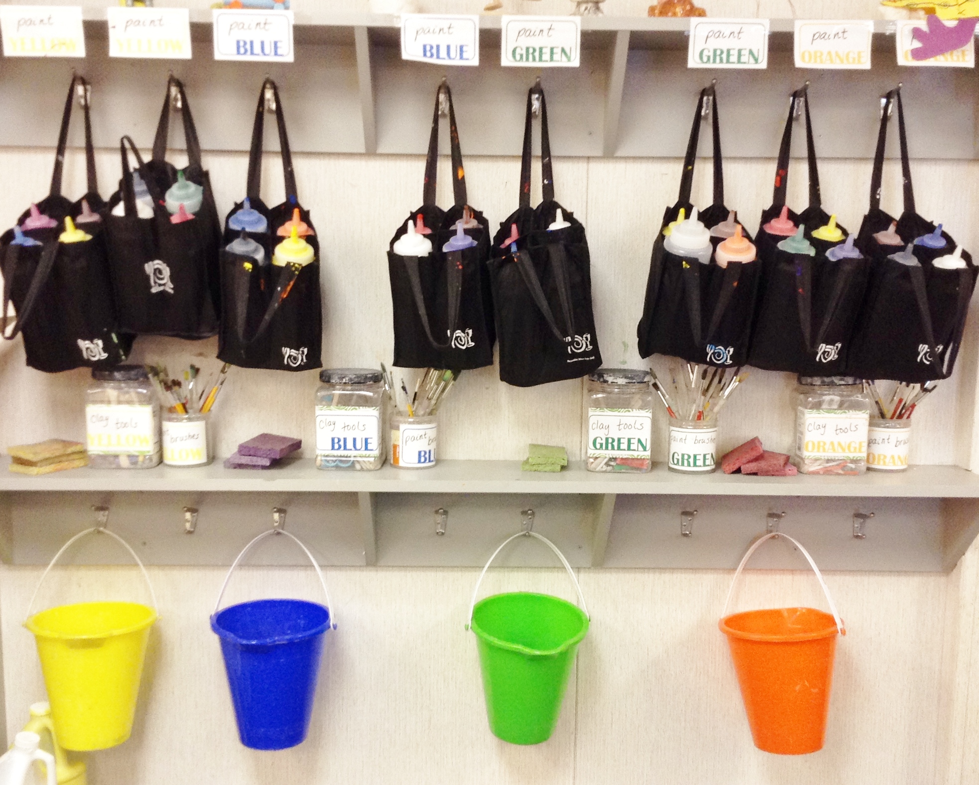 I’ve been streamlining my supply distribution and my new paint station this year, and it really helps. I have very little storage or flat surfaces in my current room, but I had a wall full of coat hooks. I dug out a whole stack of grocery store reusable beverage bags (ahem) and purchased (affiliate) these condiment bottles with some PTA money, and voila! A very functional paint station that the students know how to use! Because I modeled it for them. Many times.