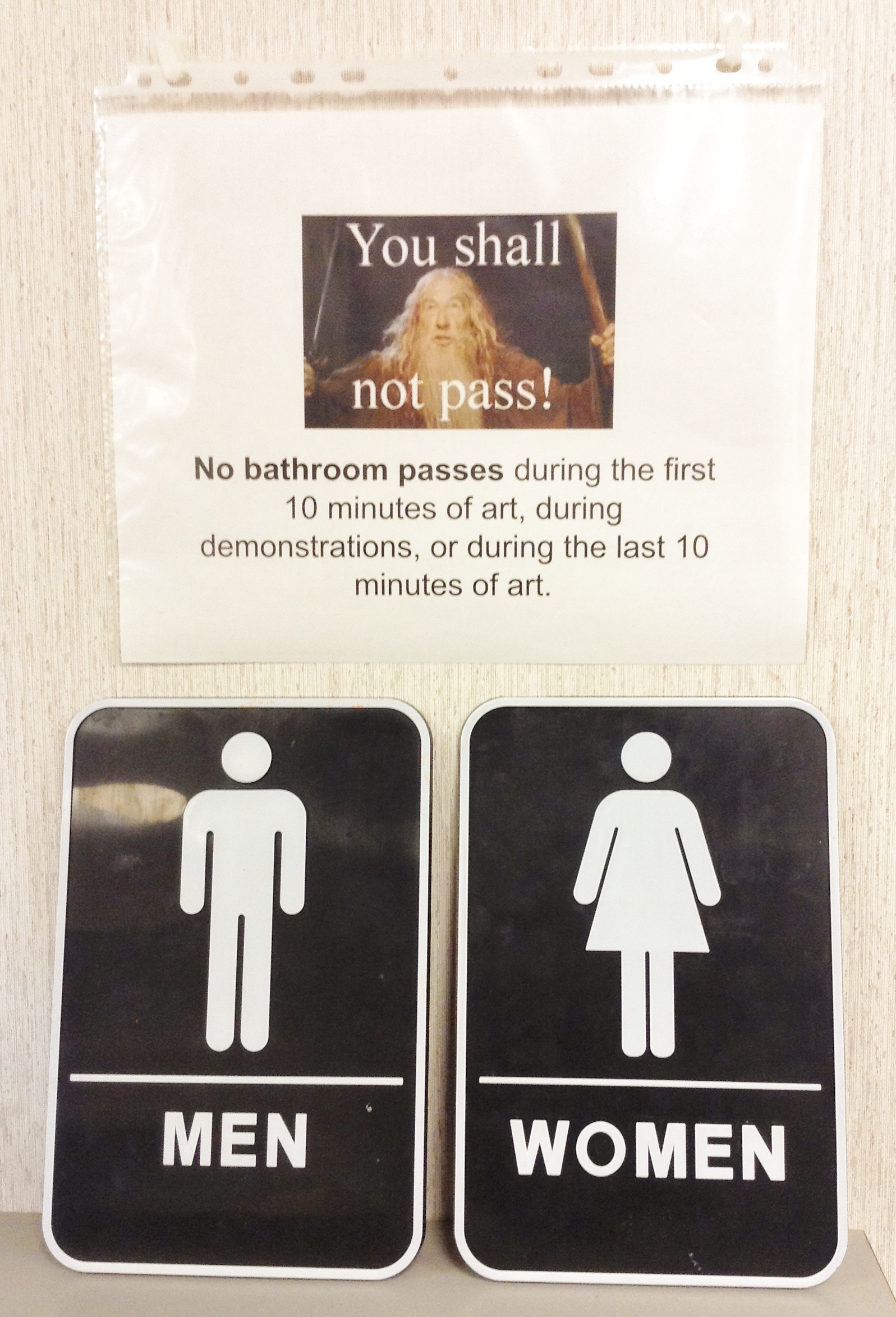 So, I came up with a new bathroom rule this year, no bathroom passes during the first ten minutes, or the last ten minutes, of art (and definitely not during demonstration time). It’s working. I find most students need to use the bathroom during instruction time or clean-up time. Coincidence? I don’t think so. Students rarely ask to use the bathroom while they are actually engaged and working, and if they do, I can usually tell it’s a legit emergency.